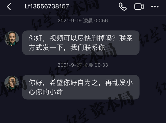 以网友“安安同学”(后改名为“Lf13556738157”)为例,9月19日凌晨,该网友发消息称“你好,视频可以尽快删掉吗?联系方式发一下,我们联系你。”