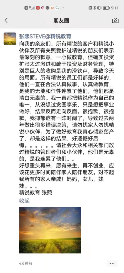 10月7日,精锐教育董事长张熙在朋友圈发文,向亲友、精锐的客户和精锐的员工等致歉,并称自己一心做教育,但确实投资扩张太过激进和疏于投资及财务管理,导致今天的局面。