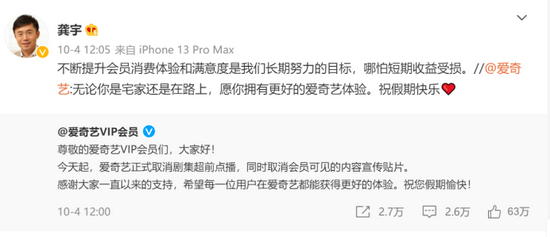 2021年10月4日中午12点,爱奇艺率先宣布取消“超前点播”;