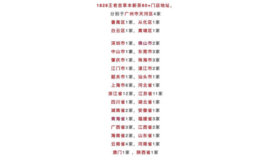 从1828王老吉草本新茶的官方微信公众号,目前共有80+门店地址。刘奎透露,关店潮是从年后开始,每月都有5-6家关店。他所知道的,就有二三十家,“现在应该过半了。”
