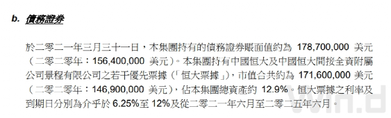 截至2021年3月31日,中誉集团持有恒大票据市值合共约为1.72亿美元,占总资产约12.9%。