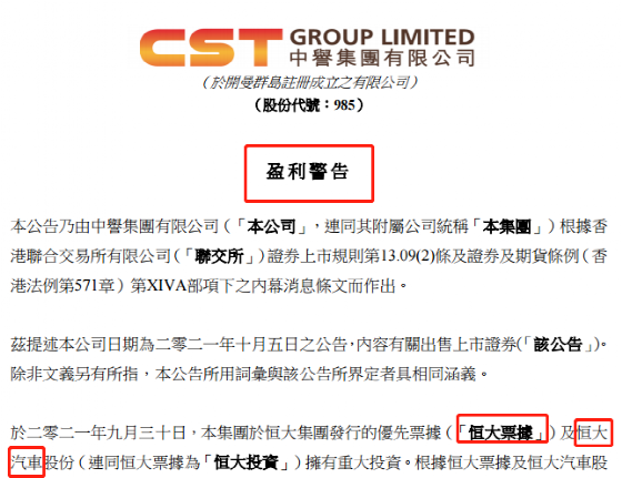 根据中誉集团公告,截至2021年9月30日,其在恒大集团优先票据及恒大汽车股票上拥有重大投资。以恒大票据及恒大汽车股票截至9月30日的收市价估算,其预期截至2021年9月30日的六个月中期业绩将录得重大亏损,其中来自恒大优先票据和恒大汽车股票的未变现亏损分别约1.35亿美元及约2.96亿美元。