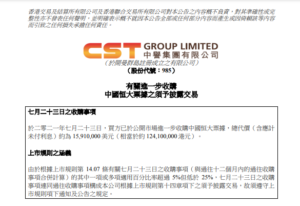 2021年7月19日,广发银行提出冻结恒大资金的消息传出之后,恒大债券暴跌。当晚,中誉集团突发公告称,其通过证券经纪商于公开市场收购总额为1100万美元2024年到期的10.5%中国恒大优先票据。7月23日,中誉集团再发公告称,“公司的间接全资附属公司立天科技有限公司已于公开市场进一步收购中国恒大票据”,总代价(含应计未付利息)约为1591万美元(相当于约1.241亿港元)。