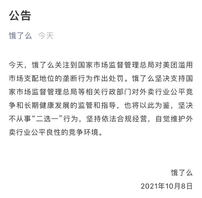 商业 饿了么公告坚决不从事二选一行为:自觉维护公平良性竞争环境 2021-10-09 08:43:20 分享 来源:三言财经饿了么今日发布公告称,坚决支持国家市场监督管理总局等相关行政部门对外卖行业公平竞争和长期健康发展的监管和指导,也将以此为鉴,坚决不从事“二选一”行为,坚持依法合规经营,自觉维护外卖行业公平良性的竞争环境。