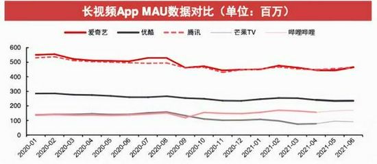 根据极光数据跟踪,2021年4-6月腾讯视频、爱奇艺、B站、优酷、芒果TV的月活跃用户规模分别为4.48/4.55/4.64亿、4.46/4.44/4.66亿、1.56/1.67/1.71亿、2.41/2.34/2.35亿、0.78/0.95/0.91亿。