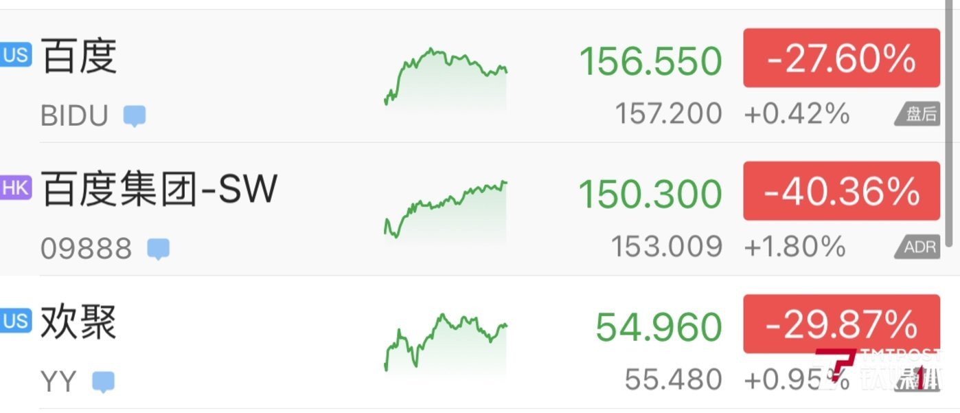 截止北京时间10月8日早上7点,受到中概股整体向好影响,欢聚集团美股报收54.96美元/股,涨4.17%,市值为43.09亿美元;百度美股(NASDAQ:BIDU)今早收盘报156.55美元/股,涨4.81%,盘后涨幅缩窄到0.42%,市值为553.57亿美元;百度港股(09888.HK)6日下跌1.44%,7日则涨4.88%,最新报145.20港元/股。与3月回港二次上市时相比,百度港股已暴跌41%,最新市值为4185亿港元。