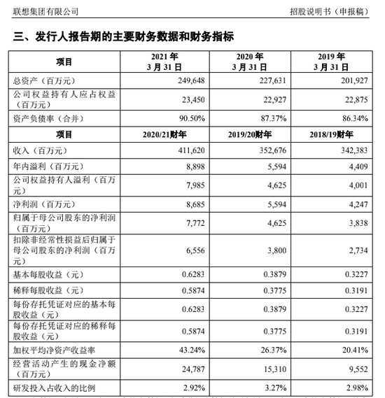 招股书显示,联想在过去三个财年的研发投入分别是102.03亿元、115.17亿元和120.38亿元,占比分别是2.92%、3.27%和2.98%。