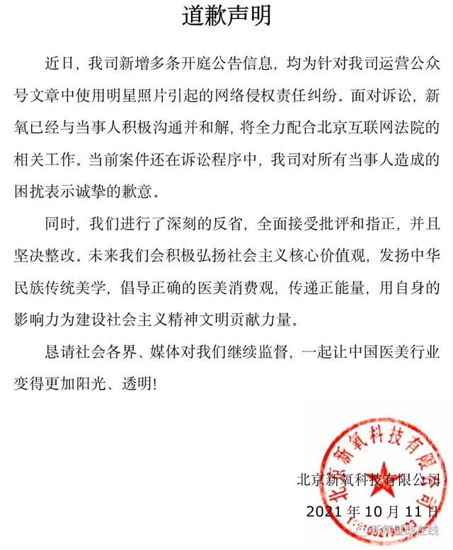 今日,新氧旗下“新氧健康在线”公众号发布了道歉声明,针对使用明星照片引发的网络侵权责任纠纷向当事人进行道歉,并表示,公司正在与当事人积极沟通和解。