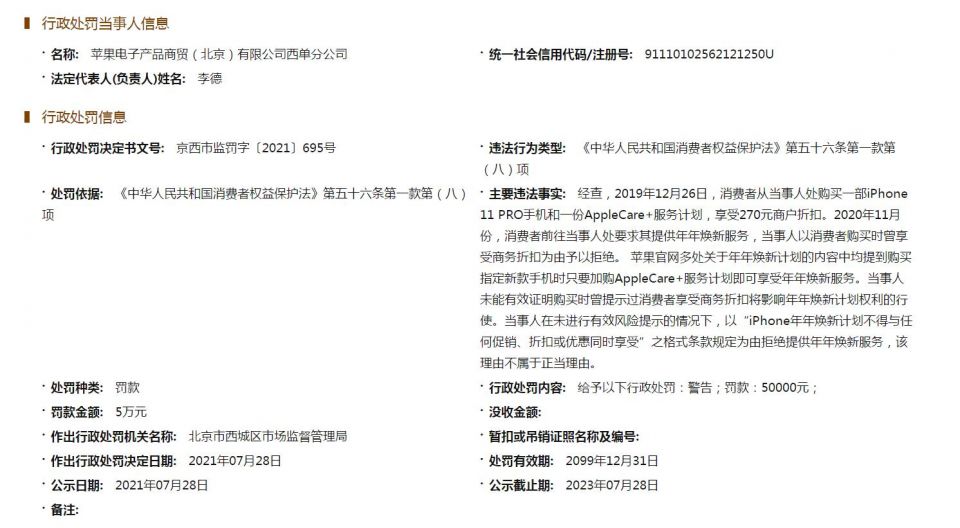 京西市监罚字〔2021〕695号行政处罚决定书显示,苹果西单公司主要违法事实为:经查,2019年12月26日,消费者从当事人处购买一部iPhone 11 PRO手机和一份AppleCare+服务计划,享受270元商户折扣。2020年11月份,消费者前往当事人处要求其提供年年焕新服务,当事人以消费者购买时曾享受商务折扣为由予以拒绝。