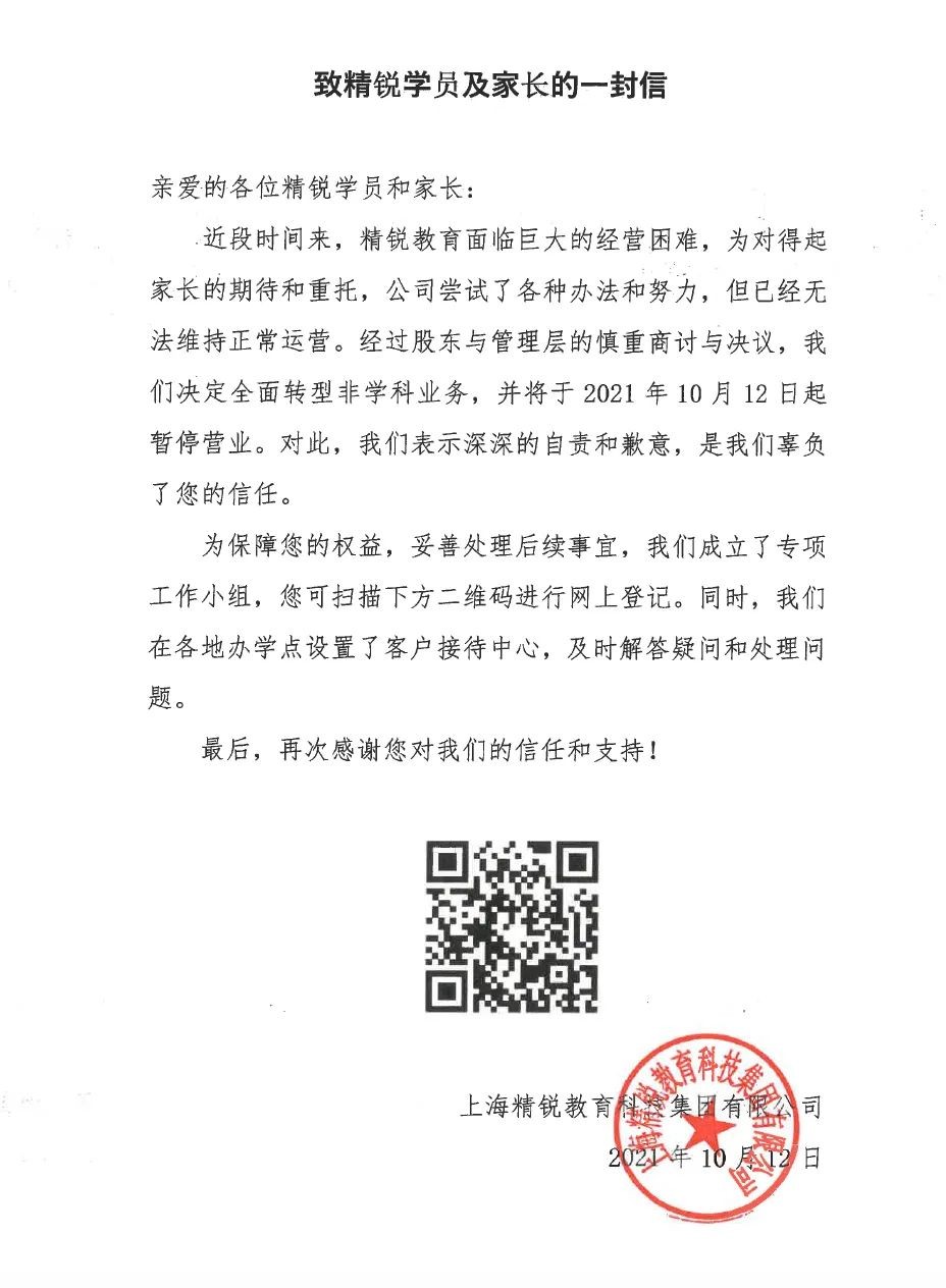今日,精锐教育通过其微信公众号发布《致精锐学员及家长的一封信》。信中提到,近段时间来,精锐教育面临巨大的经营困难,为对得起家长的期待和重托,公司尝试了各种办法和努力,但已经无法维持正常运营。经过股东与管理层的慎重商讨与决议,我们决定全面转型非学科业务,并将于2021年10月12日起暂停营业。