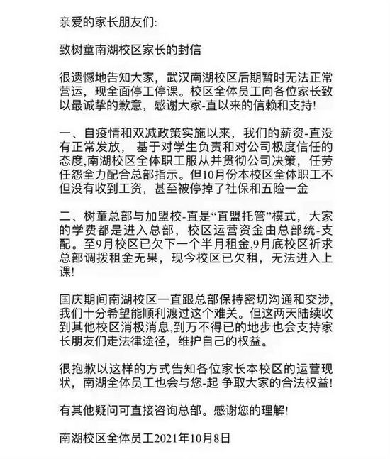 高女士提供给极目新闻记者的停课通知显示,树童总部与加盟校一直是“直盟托管"模式,校区运营资金由总部统一支配。9月,武汉南湖校区已欠下一个半月租金,曾于9月底请求总部调拨租金,无果,导致校区欠租无法继续运行。该通知还称,自疫情和“双减”政策实施以来,校区员工一直没有按正常情况拿到薪资。