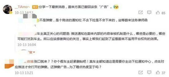 有部分网友评论称,“原Po有点误导,这是主动点击才会出现的页面,不是强制直接推出这么大广告页面的”“这是需要主动下拉通知中心,点击对应推送才会打开的弹窗。”但评论区也有网友认为,“不管如何操作,我买的汽车为什么要有广告?”
