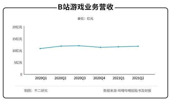 拉长时间线,B站游戏业务已连续6个季度增长疲软:2020Q1~2021Q2季度,游戏业务收入分别为11.5亿元、12.48亿元、12.8亿元、11.3亿元、11.7亿元、12.3亿元。