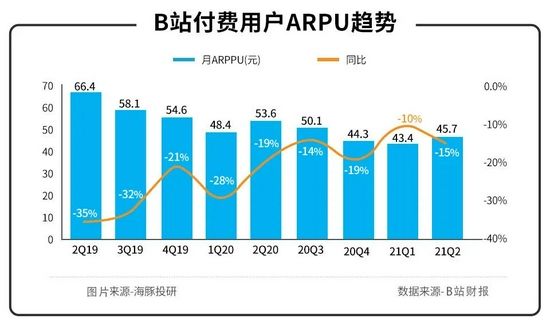 更为重要的是,其每个用户平均收入(ARPU)正在下滑:2019二季度为66.4元,2020年二季度为53.8元,同比降低18.98%;2021年二季度为45.7元,同比继续降低15.06%。