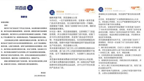 值得注意的是,茶百道官方的回应态度也是耐人寻味。针对过期珍珠一事,茶百道10月1日凌晨发布道歉信,表示对所有门店进行排查整改。有趣的是,一周后,茶百道又发表“有则改之无则加勉”的声明,称在门店中并未发现此现象。目前,该微博已被删除。