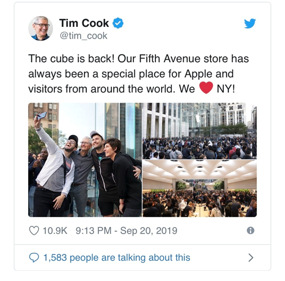 周五世界各地的消费者可以拿到三款新手机以及升级版的苹果手表和iPad。用户既可以选择送货上门,也可以到苹果实体店提货。位于曼哈顿第五大道(Fifth Avenue)的苹果旗舰店周围排起了长队,人们等着进入店内拿到最新款的iPhone 11系列手机。苹果首席执行官蒂姆·库克(Tim Cook)也亲临苹果商店现场,站在中央公园对面的苹果店前广场上与粉丝们合影留念。