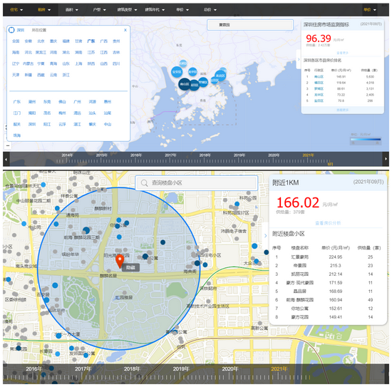 深圳与北京的情况类似。全国房价行情网数据显示,2021年9月深圳南山区平均住宅出租价格为96.39元/月/平米。以腾讯大厦为圆心,附近1千米内的住宅平均租金为166.02元/月/平米,比南山区平均价格高约70元/月/平米。