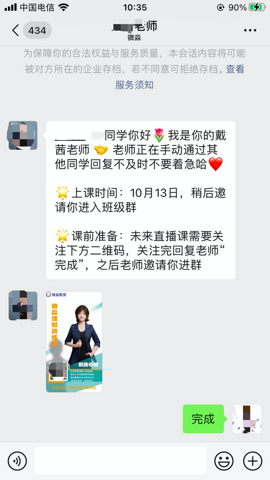 添加老师后,老师会让关注另一个公众号“微淼精品课”,告知晚上8点开课,并拉班级进群。进群后,老师会告知12天的课程分为两部分,8天直播课和4天微信班群图文课。