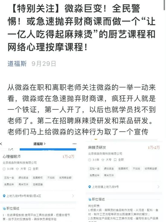 更有趣的是,“道福斯”居然还爆出微淼在招聘麻辣烫研发和菜品研发,疑似要转型。同时,微淼也在招聘心理催眠师。