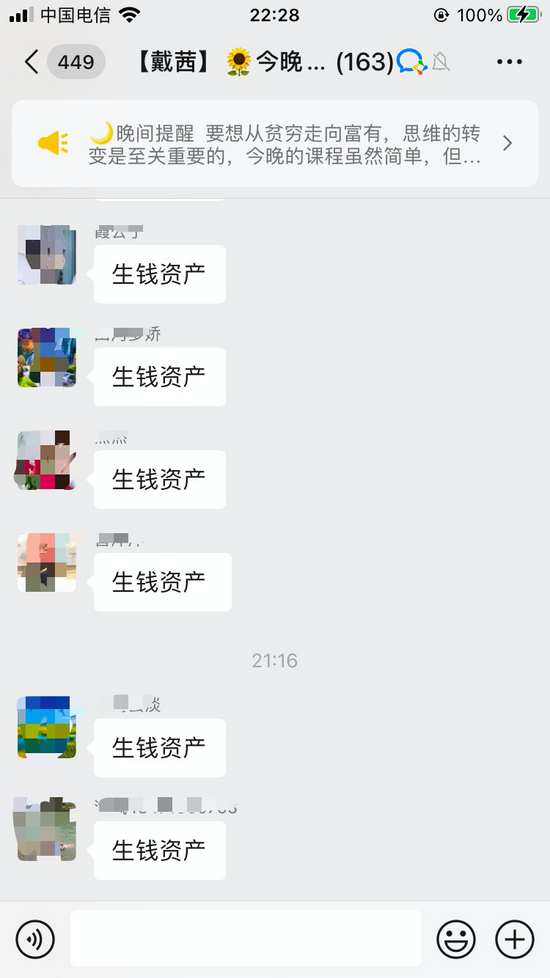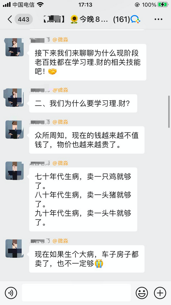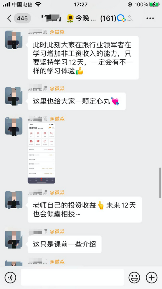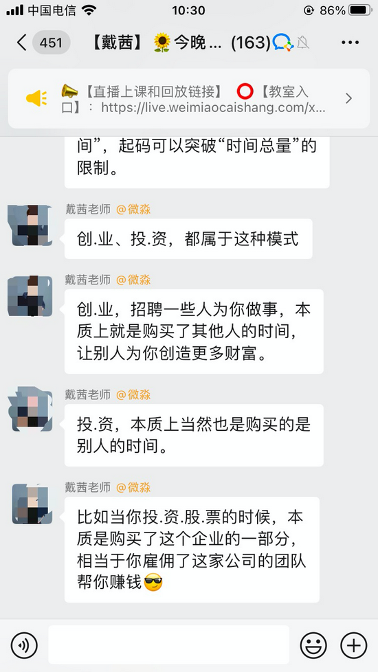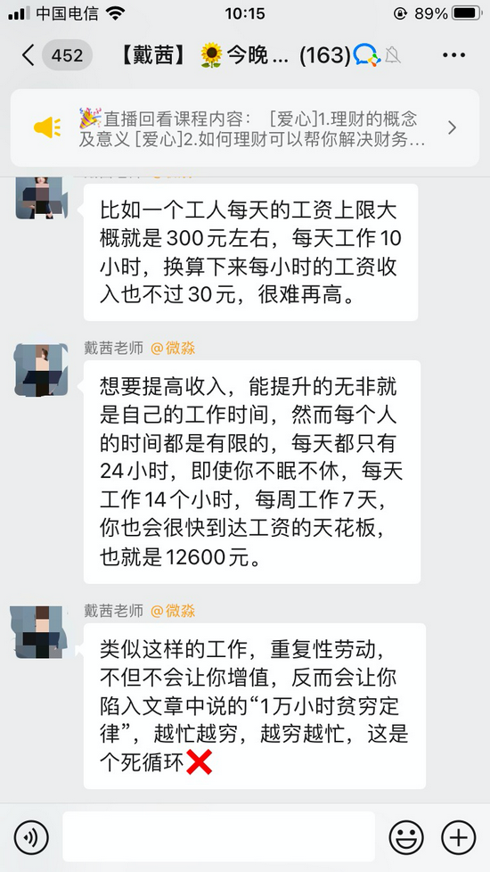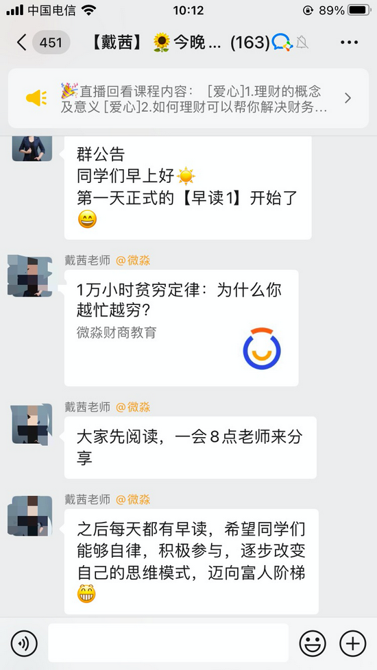 8点开课,第一天的课程主题是“看透人生穷富的关键”,直播老师虽然一直强调自己不会推荐股票、基金等,但一直举例“某些人何时如何通过股票获利多少”。