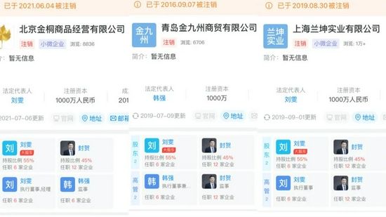 封贺除了是微淼创始人外,还是北京金桐商品经营有限公司、青岛金九州商贸邮箱公司、上海兰坤实业有限公司的股东。三家公司的股东均为刘雯和封贺。且三家公司均已注销。