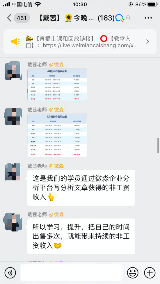 晒往期学员在微淼企业分析平台写分析文章的获得的非工资收益。