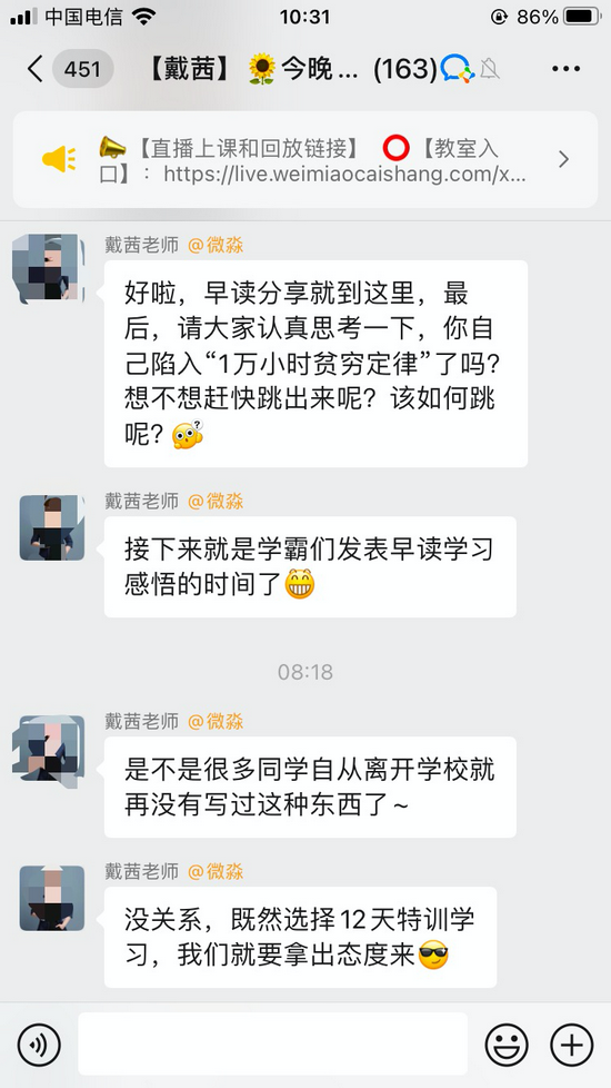 第二天早晨8:00,是早读时间,老师先发了一个“1万小时贫穷定律”的链接。