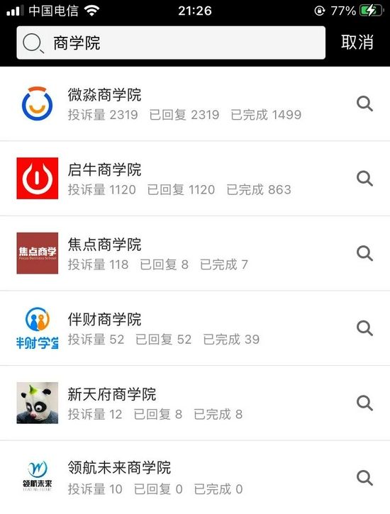 在黑猫投诉平台,除了微淼商学院外,启牛商学院的投诉量也不少,其他几个商学院的投诉量少很多。