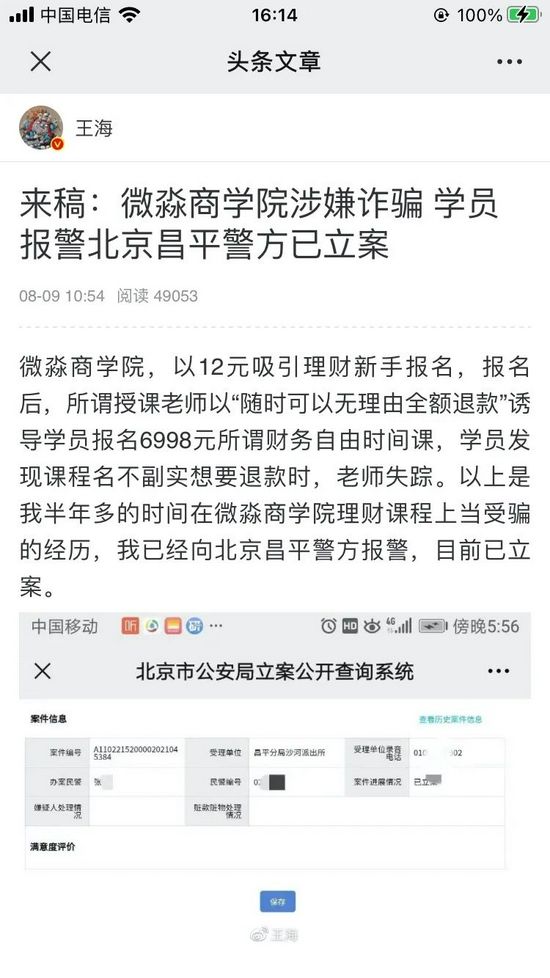王海的另一条微博显示,微淼商学院涉嫌诈骗全国多地被立案。