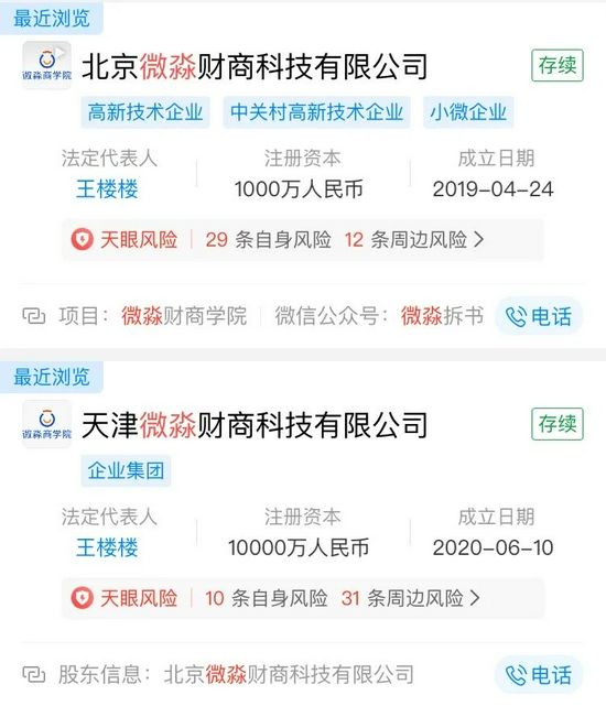 资料显示,天津微淼财商科技有限公司和北京微淼财商科技公司的法定代表人均为王楼楼。