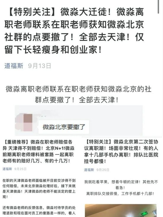 据一个重点关注微淼的个人公众号“道福斯”爆料,微淼近期似乎在大量裁员,说是北京社群的点要撤了。该账号表示天津被裁的老师得不到补偿,北京的N+1。他还声称微淼北京第二次签协议离职潮场面非常壮观,有的人拿十几部手机办离职,排队比医院挂号都慢。