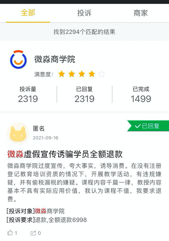 截至今天,在黑猫投诉平台上对微淼商学院的投诉量达2319条,投诉内容多为微淼商学院虚假宣传,欺诈学员,不予退款等。