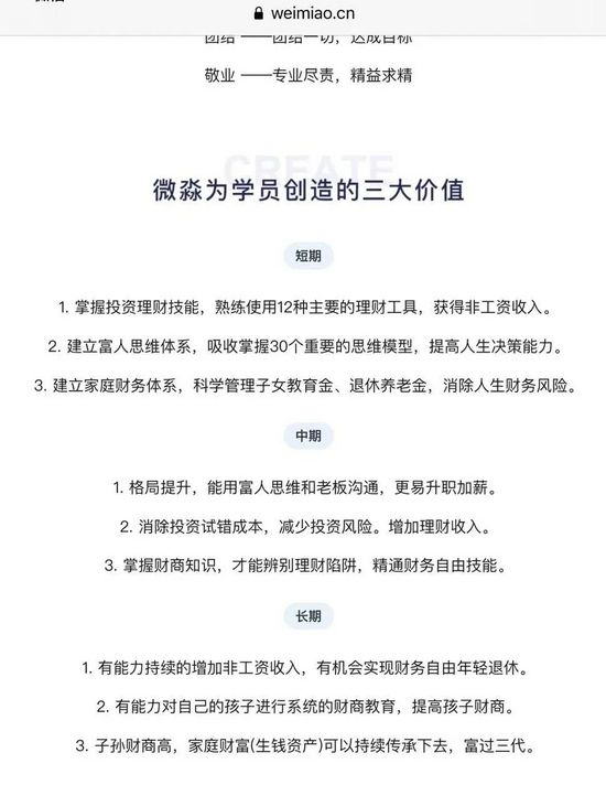 微淼官网介绍,微淼为学员创造短中长三大价值。短期内可以让学员掌握投资理财技能,建立富人思维体系,建立家庭财务体系;中期可以让学员格局提升,增加理财收入,精通财务自由技能;长期可以让学员有机会实现财务自由年轻退休,提高孩子财商,富过三代。
