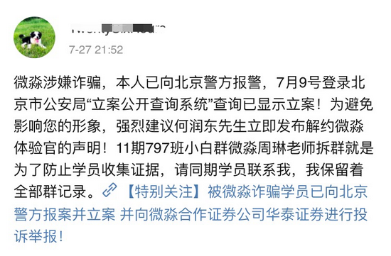 有网友表示,微淼涉嫌诈骗,已向北京警方报警,7月9日登陆北京市公安局“立案公开查询系统”查询已显示立案。11期797班小白群微淼周琳老师拆群就是防止学员收集证据。
