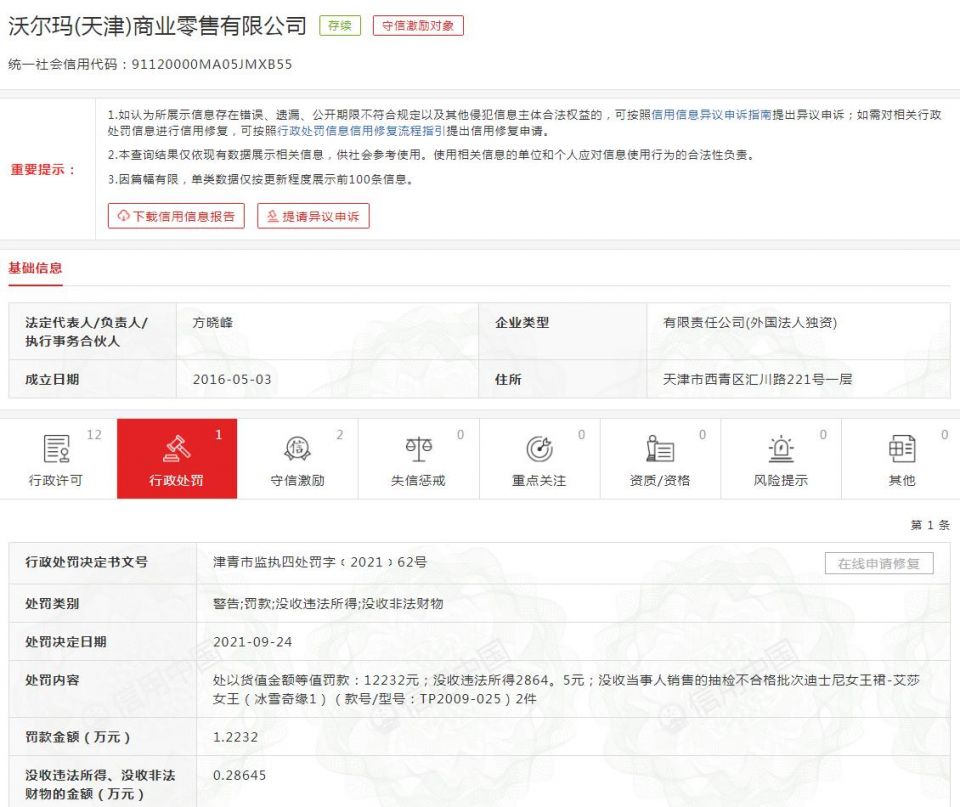 信用中国信息显示,沃尔玛天津公司销售不符合保障人体健康和人身、财产安全的国家标准的迪士尼女王裙商品,违反《中华人民共和国产品质量法》第十三条第一款,依据《中华人民共和国产品质量法》第四十九条,天津市西青区市场监管局对沃尔玛天津公司进行处罚:处以货值金额等值罚款12232元,没收违法所得2864.5元,没收当事人销售的抽检不合格批次迪士尼女王裙-艾莎女王(冰雪奇缘1)(款号/型号:TP2009-025)2件。
