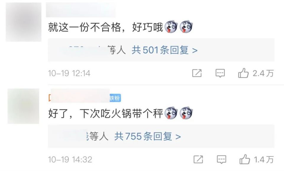 有网友表示,难道下次吃火锅还要带个秤?还有网友调侃:“就这一份不合格,好巧哦。”