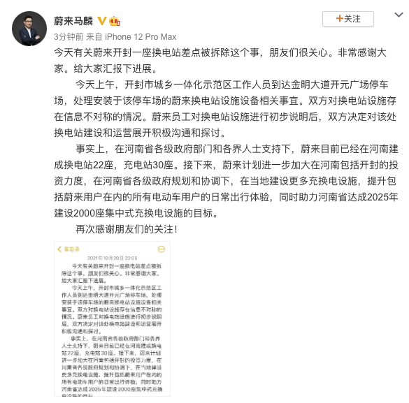 商业 蔚来回应开封一处换电站疑被拆:已开展积极沟通 2021-10-21 08:14:05 分享 来源:新浪科技10月20日晚间消息,蔚来企业传播高级总监马麟在微博发文谈到了一座河南开封的换电站差点被拆除一事,他表示:“今天上午,开封市城乡一体化示范区工作人员到达金明大道开元广场停车场,处理安装于该停车场的蔚来换电站设施设备相关事宜。双方对换电站设施存在信息不对称的情况。蔚来员工对换电站设施进行初步说明后,双方决定对该处换电站建设和运营展开积极沟通和探讨。”