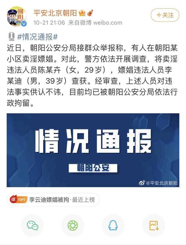 10月21日晚,北京朝阳警方通报:钢琴家李云迪因嫖娼被行政拘留。