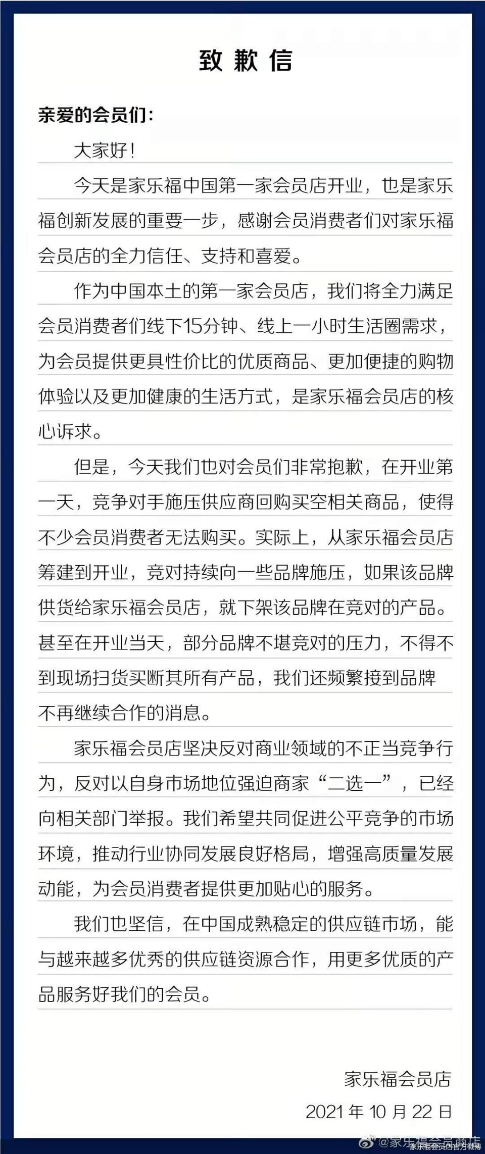 近日,家乐福会员店官方微博发布致歉信称,开业第一天,竞争对手施压供应商回购买空了相关商品,使得不少会员无法购买。目前,家乐福已经向相关部门举报。