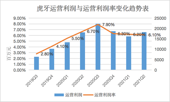 2019年Q1虎牙直播运营利润为6389万元,运营利润率为2.8%,但到了2020年Q4,2021年Q1和2021年Q2,连续三个季度虎牙的运营利润和运营利润率基本都处于横盘状态。