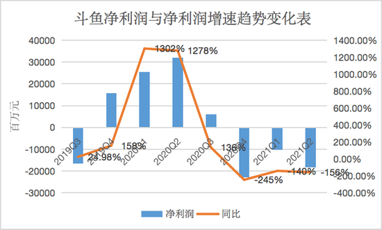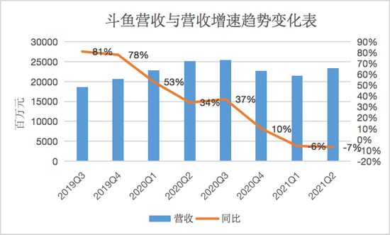 从2019年三季度开始,斗鱼的营收同比增速从81%一路跌至2021年前两个季度的负增长。