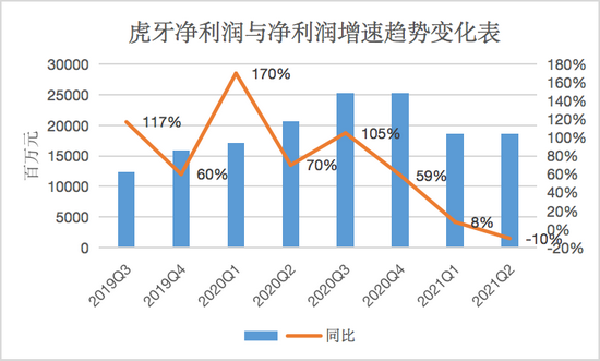 2019年Q3虎牙的营收数据为22.65亿元,同比增长77%,但到了2021年Q2虎牙的营收数据为29.63亿元,同比增长下滑至10%。