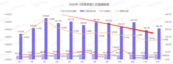2020年3月英雄联盟全网日活跃观众数还维持在274.8万人,到了2020年12月日活观众数量就只剩下206.1万人了。仅仅9个月时间,观众就流失了1/3。