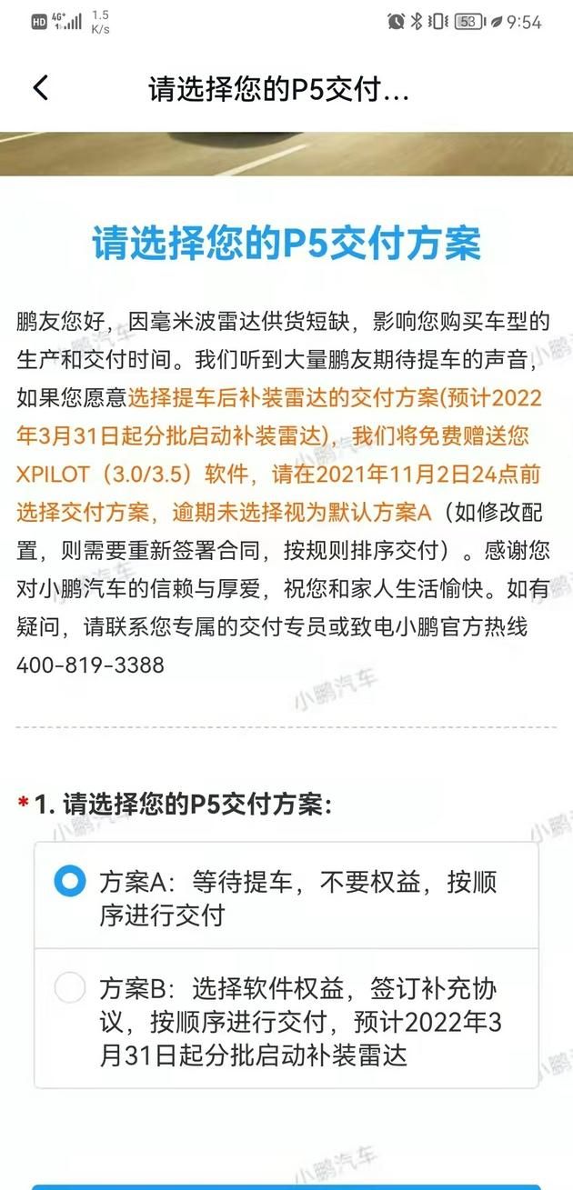 对于这些受到影响的车主,小鹏汽车提供了多样交付方案,其一是选择提车后补装雷达的交付方案,小鹏汽车预计在2022年3月31日起可以分批启动雷达补装,并对这一部分车主免费赠送XPILOT(3.0/3.5)软件。方案二是等待提车,按顺序进行交付,不过车主就需要放弃赠送权益。小鹏汽车默认的方案是方案二。