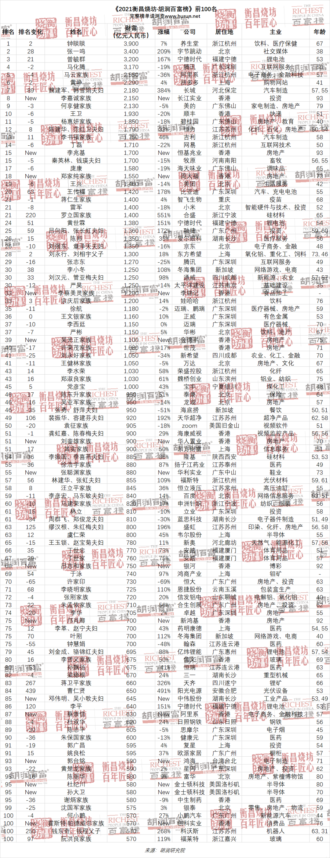 抖音创始人 38 岁的张一鸣财富增长至去年的 3 倍,增长了 2300 亿,超过马化腾和马云,以 3400 亿元跃居第二。新能源汽车电池供应商宁德时代(300750)53 岁的曾毓群财富增长至去年的近 3 倍,增长了 2000 亿,以 3200 亿元首次进入前三;长城汽车(601633)的魏建军、韩雪娟夫妇财富增长至去年的近 5 倍,增长了 1730 亿,以 2180 亿元跃居第七。