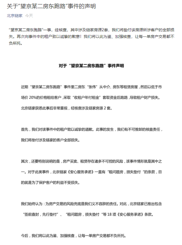 炣燃科技10月28日讯(安迪)据“北京链家”微信公众号,对于“望京某二房东跑路”一事,经核查,其中涉及链家房源2套,北京链家将垫付该房源所涉客户的全部损失。