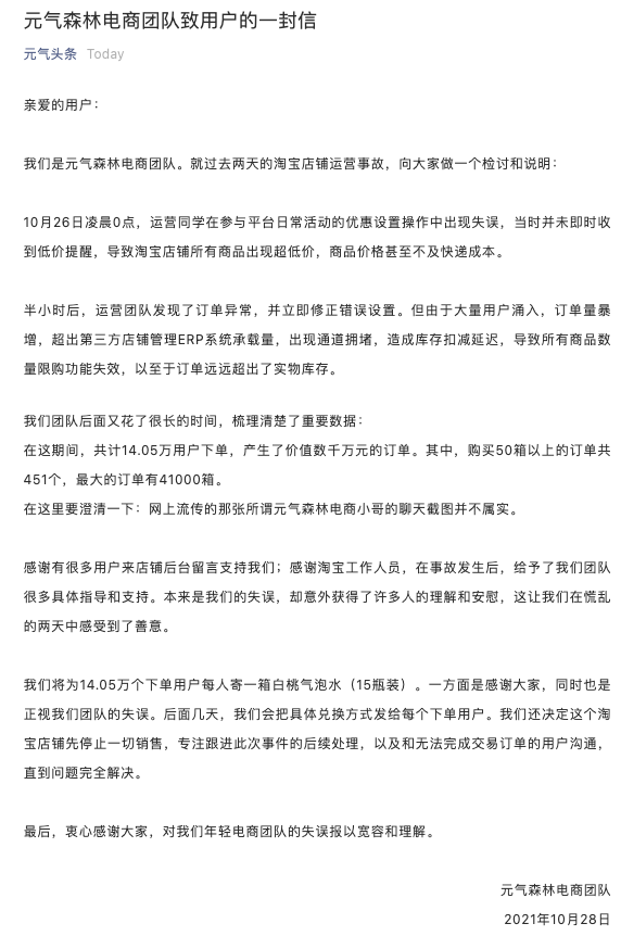 针对元气森林淘宝店铺运营事故,10月28日晚间,元气森林电商团队发布致用户公开信,称将为14.05万个下单用户每人寄一箱白桃气泡水(15瓶装),并决定这个淘宝店铺先停止一切销售,专注跟进此次事件的后续处理,以及和无法完成交易订单的用户沟通,直到问题完全解决。元气森林还表示,网上流传的那张所谓元气森林电商小哥的聊天截图并不属实。
