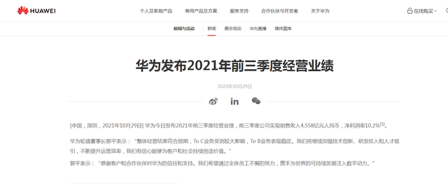 原创内容 华为今年前三季度实现销售收入4558亿元,净利润率10.2% 2021-10-29 16:33:53 分享 炣燃科技10月29日讯(江丞华) 10月29日消息,据华为今日发布的2021年前三季度经营业绩显示,该公司前三季度实现销售收入4558亿元,净利润率10.2%。公开资料显示,华为今年上半年的销售收入为3204亿元,净利润率为9.8%。对此,华为轮值董事长郭平表示:“整体经营结果符合预期,To C业务受到较大影响,To B业务表现稳定。我们将继续加强技术创新、研发投入和人才吸引,不断提升运营效率,我们有信心能够为客户和社会持续创造价值。”
