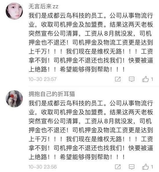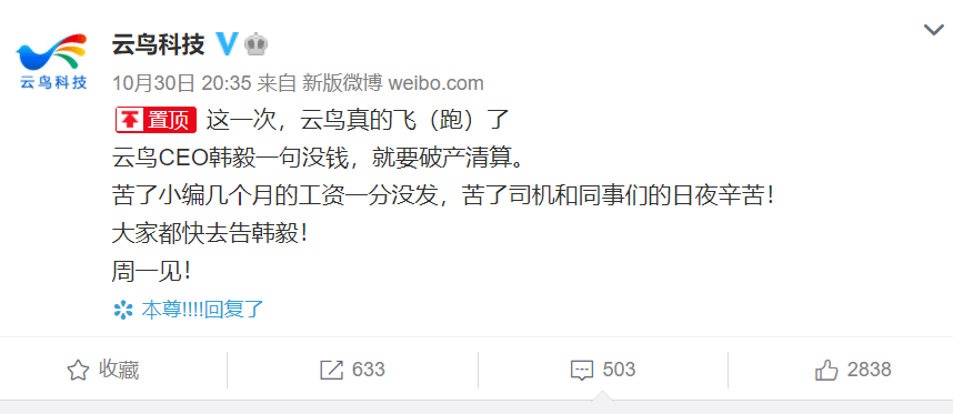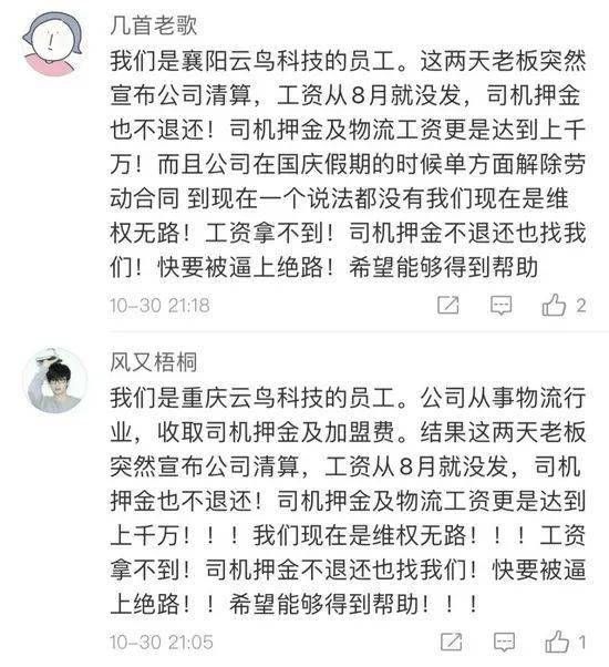 10月30日,物流公司@云鸟科技 的官微发文,矛头直接对准了CEO韩毅,直言“大家都快去告韩毅”。这位员工称已经几个月没发工资了,而韩毅却一句没钱就要破产结算,“苦了司机和同事们的日日夜夜”。 在这条声讨博文下,不少员工加入到声讨大军。他们来自全国各地,有北京的、重庆的、襄阳、徐州、郑州等。