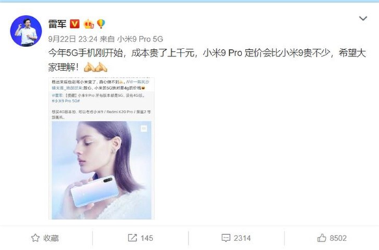 昨日晚间,@雷军 暗示小米9 Pro的价格不会很便宜:“今年5G手机刚开始,成本贵了上千元,小米9 Pro 定价会比小米9贵不少,希望大家理解。”